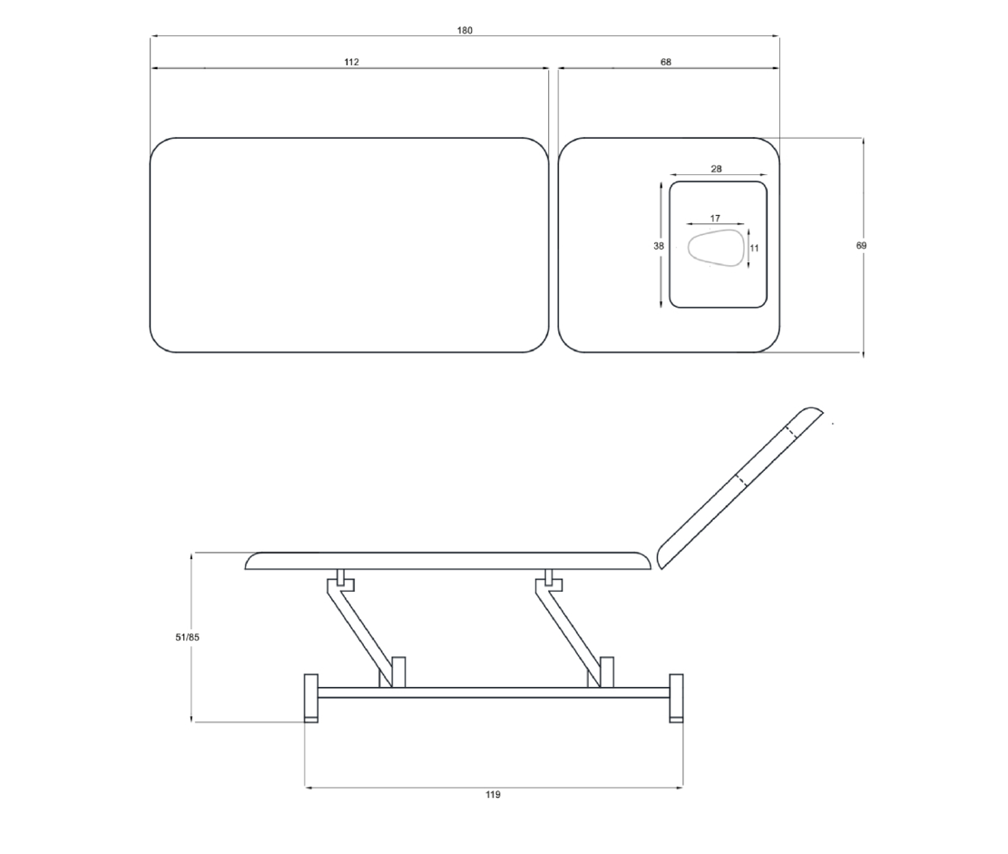Opremljen 1 motorom koji omogućuje podešavanje visine pomoću ručnog upravljača. Naslon se podešava hidrauličnim liftom.