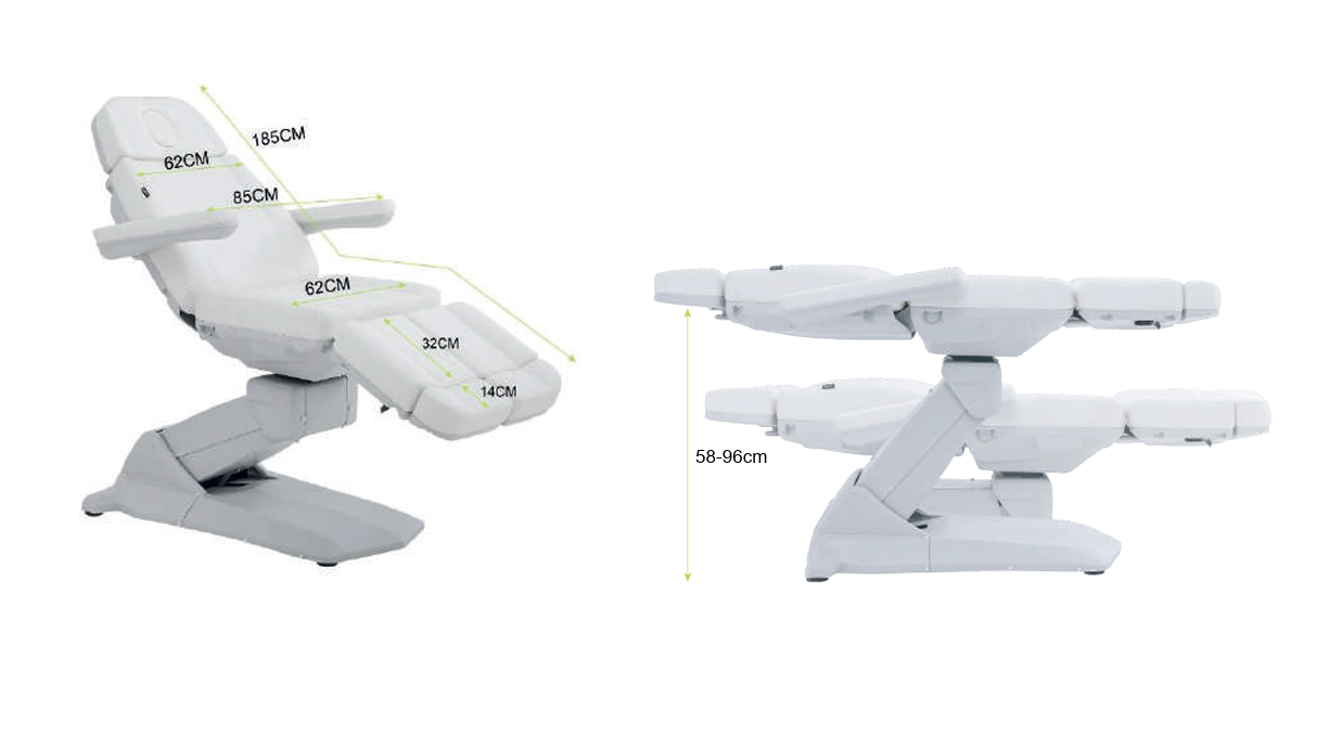 Moderna vrhunska stolica za pedikuru i podijatriju s vrlo stabilnom strukturom. Opremljena s 3 motora koji kontroliraju visinu, nagib naslona i kut sjedala. Oslonci za noge podesivi po visini neovisno plinskim podizačem. Sklopivi nasloni za ruke i podesivi naslon za glavu s otvorom za lice. Presvučena visokokvalitetnim bijelim PU, lako se čisti.