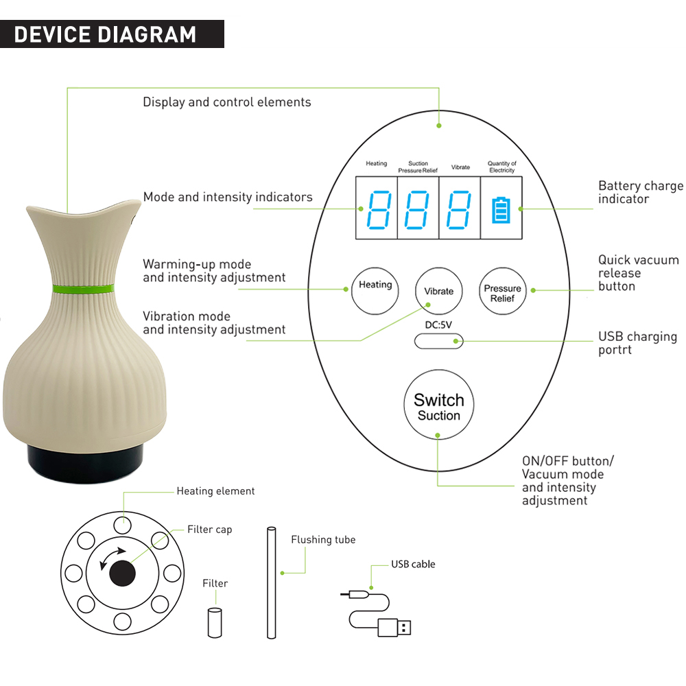 Uređaj ima sljedeće načine djelovanja: način vakuumskog rada,vibracije i zagrijavanja. Svi ovi načini mogu se omogućiti istovremeno ili odvojeno.